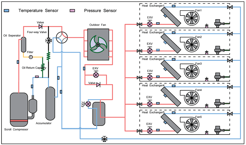 This schematic shows a variable-refrigerant-flow (VRF) air-conditioning heat-pump serving multiple indoor coils. An inverter scroll compressor drives refrigerant through a four-way reversing valve so the system can cool or heat. The outdoor coil (with fan) acts as the condenser in cooling and the evaporator in heating. Refrigerant is distributed to each indoor heat exchanger via headers; every indoor has its own electronic expansion valve (EXV) for precise capacity control. Temperature (blue) and pressure (pink) sensors feed the controller for stable operation, superheat management, and fault monitoring.