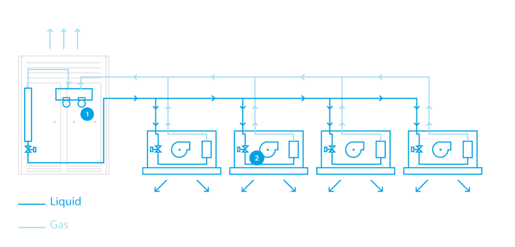A single outdoor unit modulates refrigerant flow to multiple indoor fan-coil units. All zones run in the same mode (cool or heat) at a time. The dark line = liquid and the light line = gas; refrigerant is distributed along the main header and branched to each indoor. Each indoor unit has its own electronic expansion valve (EEV) to control capacity, while the outdoor inverter compressor varies output to match total load.